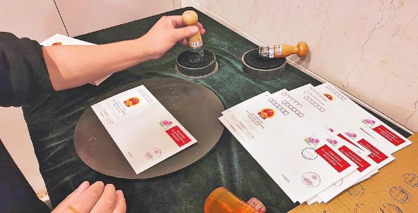 工作人員為全國兩會紀(jì)念封加蓋紀(jì)念戳