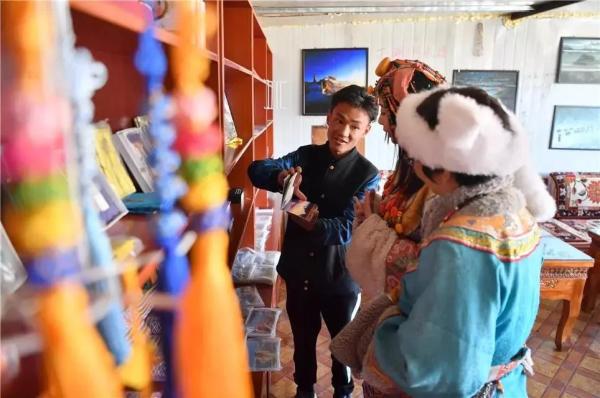 西藏自治區(qū)納木錯自然保護區(qū)郵局,旦增洛珠(左)正在給游客介紹旅游產品。自農村電商工作開展以來,西藏郵政已在全區(qū)各地(市)多個郵政營業(yè)網點、便民服務站、小商超店、旅游景點等地建立“郵掌柜”、郵樂購、郵樂網、天上西藏E郵等網上購物和銷售系統(tǒng)。