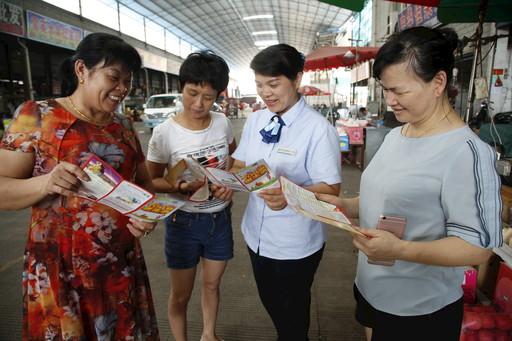 潘春蓮在果蔬批發(fā)市場(chǎng)宣傳郵儲(chǔ)銀行信用卡權(quán)益活動(dòng)