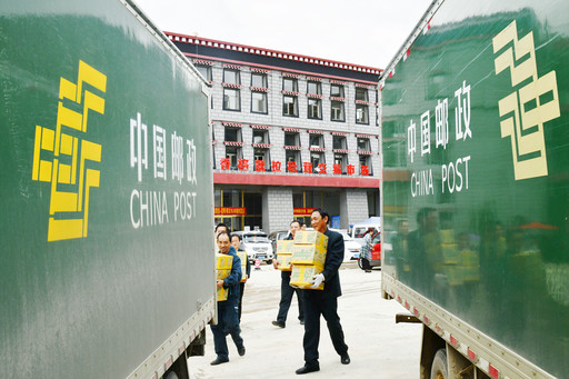 在香格里拉松茸交易市場,郵政工作人員將松茸郵件裝車。一件件、一車車松茸通過郵政渠道走出雪域藏鄉。
