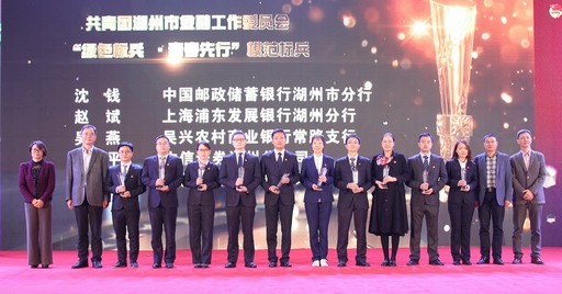 在浙江省湖州市金融系統(tǒng)近日舉辦的“建功新時(shí)代 金融青年說”演講比賽上,共青團(tuán)湖州市委對湖州市“綠色金融青年先行”十大模范標(biāo)兵進(jìn)行了表彰,郵儲(chǔ)銀行湖州市分行的沈錢(左六)獲得此項(xiàng)榮譽(yù)。