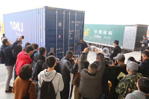 在海關(guān)工作人員及眾多媒體的見證下,運(yùn)郵集裝箱開箱。