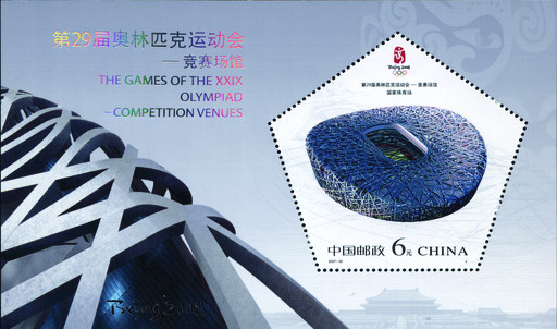 王虎鳴設計的作品《第29屆奧林匹克運動會——競賽場館》紀念郵票小型張。