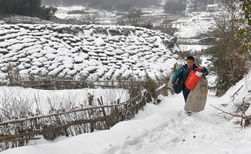 連日來,地處大別山區(qū)的安徽省六安市金寨縣普降暴雪,通村山路被冰雪覆蓋,車輛難以通行。金寨縣張沖鄉(xiāng)郵政所的投遞員谷明洲改用肩挑手提郵件,步行數(shù)十里山路,及時(shí)為群眾投送郵件。圖為金寨縣張沖鄉(xiāng)郵政所投遞員谷明洲踏著被冰雪覆蓋的山路為群眾送郵件。