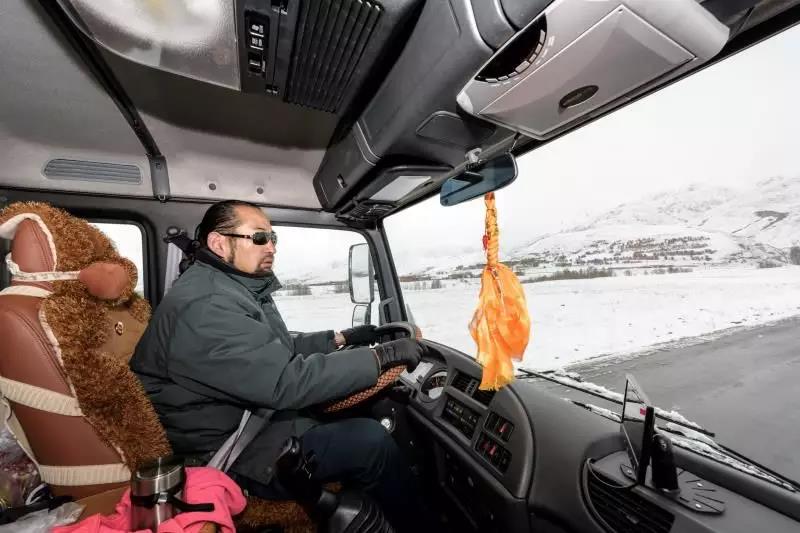 其美多吉已經(jīng)工作30年了,每次運(yùn)送郵件都是天不亮就出發(fā),迎著朝陽在路上飛馳。給我印象最深的就是郵車?yán)锟臻g很小,勉強(qiáng)可以擠下3個(gè)人,而且每次過減速帶的時(shí)候,整個(gè)人都會(huì)被顛簸得飛起來。路上我問其美多吉,你們這個(gè)郵車駕駛室空間這樣狹窄,休息都很費(fèi)勁,不難受嗎?他卻說這輛車是新的,條件不知道比以前好多少倍。以前的車?yán)镞B空調(diào)都沒有,一開起來灰塵也很大,這輛新車有空調(diào),有一個(gè)小小的臥鋪,還有GPS定位,他非常滿意。