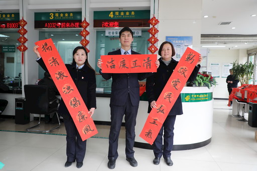 日前,郵儲銀行河南省開封市分行紀委分派紀檢監(jiān)察人員到各支行網(wǎng)點進行檢查并送去廉潔春聯(lián)。該分行紀委強調(diào)節(jié)日期間各單位要深入貫徹落實中央八項規(guī)定精神,持之以恒正風(fēng)肅紀,嚴防“四風(fēng)”問題反彈回潮。通過送廉政春聯(lián)提醒廣大干部職工在節(jié)日期間要廉潔自律。圖為濱河路支行員工展示廉潔春聯(lián)。 □魏慧敏 攝影報道