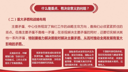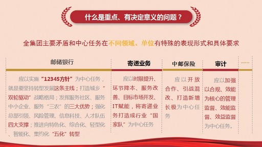 比如,郵儲(chǔ)銀行面臨哪些挑戰(zhàn)?寄遞業(yè)務(wù)面臨哪些挑戰(zhàn)?保險(xiǎn)業(yè)務(wù)面臨哪些挑戰(zhàn)?我們的普遍服務(wù)面臨哪些挑戰(zhàn)?了解了這些主要矛盾,還要明確解決的方案和具體措施,明確我們的中心任務(wù)。比如對(duì)郵儲(chǔ)銀行,我們提出要以實(shí)施“12345”的工作思路作為中心任務(wù),就是要堅(jiān)持轉(zhuǎn)型發(fā)展這條主線,打造城鄉(xiāng)“雙輪驅(qū)動(dòng)”戰(zhàn)略格局,發(fā)揮服務(wù)社區(qū)、服務(wù)中小企業(yè)、服務(wù)“三農(nóng)”的三大優(yōu)勢(shì),強(qiáng)化總部引領(lǐng)、風(fēng)險(xiǎn)管理、信息科技、人才隊(duì)伍四大支撐,推進(jìn)向特色化、綜合化、輕型化、智能化、集約化“五化”轉(zhuǎn)型;對(duì)寄遞業(yè)務(wù),要以“時(shí)限提升、環(huán)節(jié)降本、服務(wù)改善、目標(biāo)市場(chǎng)開(kāi)發(fā)、IT賦能”的思路,將寄遞業(yè)務(wù)打造成“國(guó)家隊(duì)”作為中心任務(wù);對(duì)中郵保險(xiǎn),要以開(kāi)放合作、引戰(zhàn)混改、打造成新的增長(zhǎng)極作為中心任務(wù)。還有審計(jì)工作,要以加強(qiáng)以合規(guī)、效能為核心的管理監(jiān)督、效能監(jiān)督、效益監(jiān)督為中心任務(wù)。
