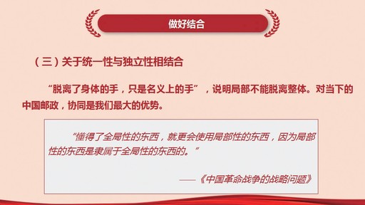 戰(zhàn)略目標(biāo)既定,中心任務(wù)已明,怎么落地?黨課不僅交任務(wù),也教方法,從著眼全局、突出重點(diǎn)、兼顧各方、照應(yīng)階段、抓住機(jī)遇、做好結(jié)合這6個(gè)方面詮釋了提升戰(zhàn)略思維能力的方法和步驟。時(shí)而引經(jīng)據(jù)典,時(shí)而對(duì)比國(guó)內(nèi)外同業(yè),黨課把高深的理論變?yōu)橥ㄋ滓锥闹v解。