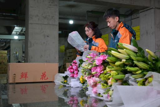 鮮花寄遞創客團隊的郵政“小哥哥”“小姐姐”正在認真包裝鮮花。