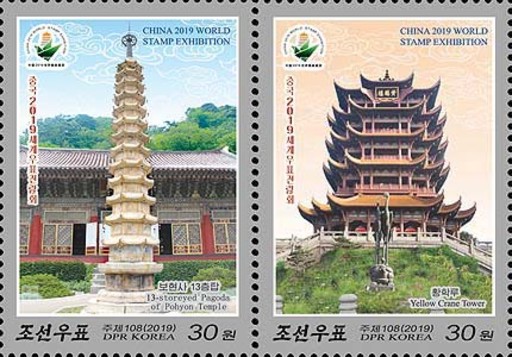 朝鮮為此次世界郵展發(fā)行郵票2種、郵資片1種,圖案選用兩國的古建筑——武漢黃鶴樓和平壤普賢寺古塔。朝鮮普賢寺建于1042年,13層古塔是普賢寺的鎮(zhèn)寺之寶,經(jīng)歷風(fēng)雨滄桑,底座部分白石變成了褐色(圖3)。