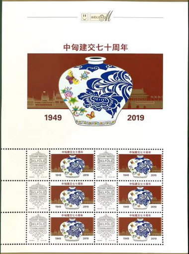 為慶祝中國與匈牙利建交70周年,匈牙利于5月23日發(fā)行了一套《中匈建交七十周年》紀(jì)念郵票(圖4),并在匈牙利國家行政大學(xué)內(nèi)舉辦了發(fā)行儀式。該套郵票共有2枚,由來自中國的趙文潔和匈牙利的設(shè)計師瑪媞·阿萊克絲分別設(shè)計1枚,在兩枚郵票的背景當(dāng)中都能看到中國天安門和匈牙利國會大廈的部分圖形元素。匈牙利設(shè)計師采用了中國的祥云作為主要圖案,并在紀(jì)念周年的數(shù)字中融入了匈牙利的傳統(tǒng)刺繡花紋。中國設(shè)計師表示瓷瓶代表著“平安與和平”,圓形瓶體則代表著“友好與圓滿”,并將中國牡丹以及匈牙利傳統(tǒng)花卉圖案與青花瓷瓶相結(jié)合,象征兩國政府和人民之間親切、緊密的友誼。