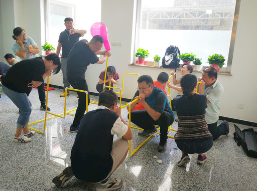 “呼吸的力量”環(huán)節(jié)中,每個(gè)小組得到一張“呼吸機(jī)”的搭建圖紙和部分搭建材料,僅有一位組員可看見圖紙,需向其他組員描述圖紙內(nèi)容,并配合大家搭建好“呼吸機(jī)”。“指壓板上的挑戰(zhàn)”環(huán)節(jié)中,下設(shè)雙人跳繩、背重物、“人體錘”等幾個(gè)小項(xiàng)目。兩個(gè)項(xiàng)目均考驗(yàn)了團(tuán)隊(duì)的溝通能力、信息傳達(dá)效率、執(zhí)行力和凝聚力。 □楊光 張建勤 攝影報(bào)道
