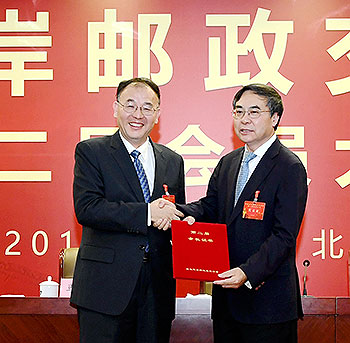 國家郵政局局長馬軍勝向集團(tuán)公司董事長劉愛力頒發(fā)海峽兩岸郵政交流協(xié)會(huì)第二屆會(huì)長證書