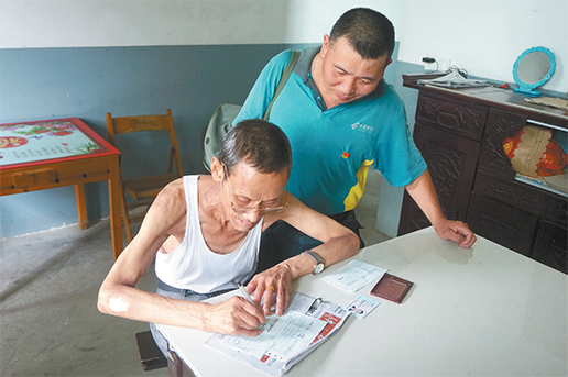 劉彩陸指導(dǎo)鐘福爐老人填寫取款單。
