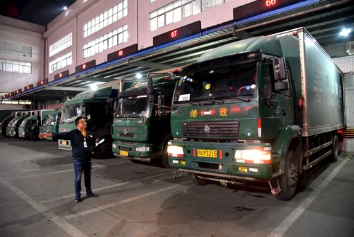 11月11日凌晨,湖北省武漢郵區(qū)中心局調度員楊成剛忙著指揮車輛進出垛口。 □郝振寧 攝影報道