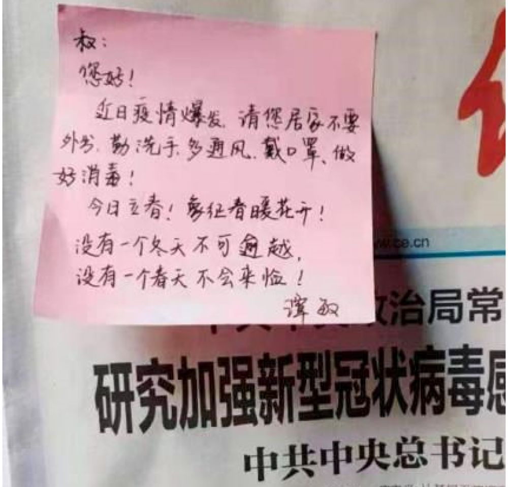 2月4日,正值立春節(jié)氣。在這個充滿希望的日子,譚敏寫下了一張張滿懷關切的“防疫小紙條”,叮囑用戶們做好自身防護,注意身體健康,要相信“沒有一個冬天不可逾越,沒有一個春天不會來臨”。當天下午,客戶李先生在取報紙時,看到了貼在報紙上的小紙條。他立即給譚敏打電話說:“小譚,你的囑咐我收到了,我和你阿姨很好,謝謝!你每天外出工作,一定要注意安全!”話音未落,譚敏已淚目。
