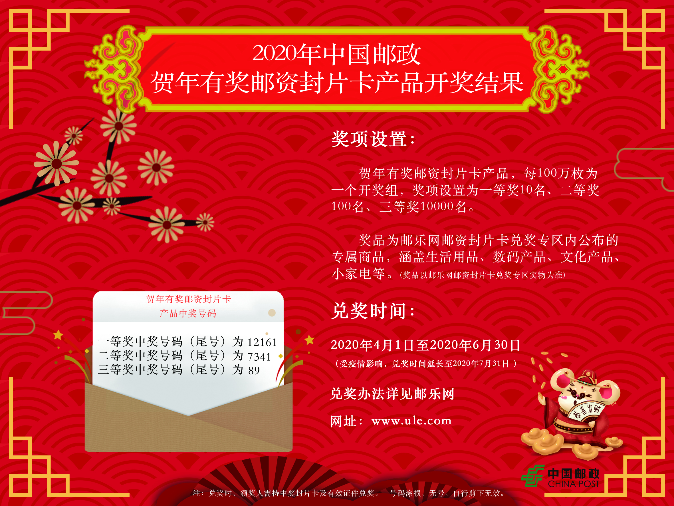 2020年賀年有獎(jiǎng)郵資封片卡中獎(jiǎng)號(hào)碼于3月18日產(chǎn)生?,F(xiàn)將具體中獎(jiǎng)信息通知如下: