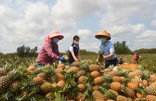 圖為文昌市支行信貸員深入菠蘿種植基地開展金融服務(wù),與農(nóng)戶共迎豐收?! 鹾D嫌浾?nbsp; 梁磊 攝影報道