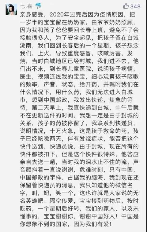 “感謝郵政,讓我被困在湖北那段日子里,還能收到來自外地小伙伴的防疫用品援助,余后很多年都會(huì)記得,在2020年初那個(gè)困難的日子里,祖國需要,郵政在!”