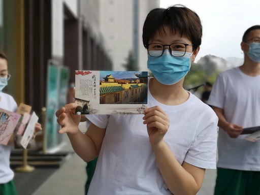3月26日下午,人民日報社新媒體中心、武漢市郵政分公司、武漢武昌區(qū)疫情防控指揮部共同舉辦“同舟共濟 感恩有您”為援漢醫(yī)療隊贈禮活動,醫(yī)療隊員們對武漢風(fēng)光明信片愛不釋手。圖為醫(yī)療隊員展示自己最喜歡的武漢大學(xué)風(fēng)光明信片?!趵顫h梅 攝