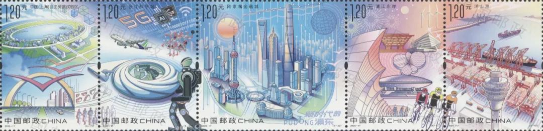 30年來,浦東在一片阡陌農(nóng)田上建成了一座功能集聚、要素齊全、設(shè)施先進的現(xiàn)代化城市,成為我國改革開放的象征和上?,F(xiàn)代化建設(shè)的縮影。歷史是發(fā)展的見證,郵票是時代的剪影。此次發(fā)行的《新時代的浦東》特種郵票,鮮活呈現(xiàn)了浦東勇?lián)鷩覒?zhàn)略、奮進新時代的生動實踐,有力彰顯了中國特色社會主義的強大生命力。郵票一套5枚,選取上海自貿(mào)試驗區(qū)、張江科學城、陸家嘴金融城、浦江東岸、洋山港等作為表現(xiàn)主題,將浦東日新月異的變化濃縮于方寸之間。