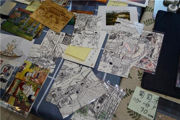 集市上有個“太陽島”的攤位吸引了很多觀眾,這里的明信片都是手繪的,因為攤主喬安是素描愛好者。攤位上,最吸引觀眾的是她手繪上海每個角落的明信片,據喬安介紹,她會和小伙伴們一起去上海的角角落落去寫生,平時在地鐵上也會拿著小本子畫車廂里的乘客,他們尋訪了藏書樓、尼姑庵、書院等遺跡。還有一些是想象結合現實的素材繪制的。她畫的最多的就是老城廂的人和街道,比如小南門、老西門一帶。這一次她從日常積累的作品里篩選了17張印刷成了明信片,希望把自己捕捉到的舊世界和幻想中的場景展現給大家。