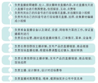 通過(guò)制作工作任務(wù)行動(dòng)表和制作直播流程安排表進(jìn)行人員安排,保證工作人員與直播環(huán)節(jié)緊緊相扣。