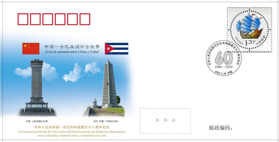 《中國古巴建交60周年紀(jì)念封》正面圖案采用中國人民英雄紀(jì)念碑和古巴何塞·馬蒂紀(jì)念碑,體現(xiàn)中國和古巴兩國不屈不撓爭(zhēng)取民族解放的偉大抗?fàn)幘瘛<o(jì)念封上所貼郵票為《夢(mèng)想啟航》個(gè)性化郵資主圖,郵戳體現(xiàn)兩國建交年份及建交60周年,紀(jì)念封的背面為說明性文字及發(fā)行信息。何塞·馬蒂是古巴詩人、民族英雄、思想家,他從15歲起就參加反抗西班牙殖民統(tǒng)治的革命活動(dòng),42歲便犧牲在獨(dú)立戰(zhàn)爭(zhēng)的戰(zhàn)場(chǎng)上,他短暫的一生完全獻(xiàn)給了爭(zhēng)取祖國古巴獨(dú)立和拉美自由的事業(yè)。