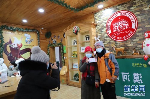12月28日,游客舉著明信片在北極村郵政支局合影。