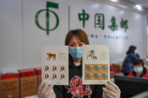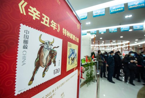 當日,中國郵政發行《辛丑年》特種郵票1套2枚,圖案分別為“奮發圖強”“牛年大吉”。