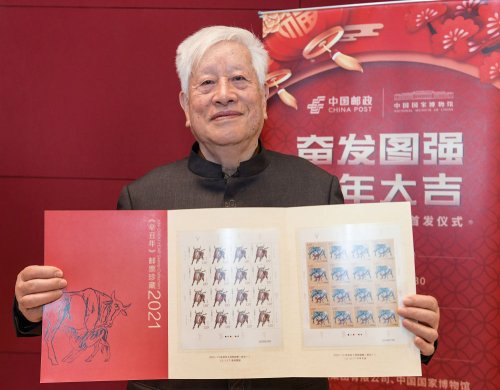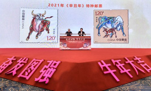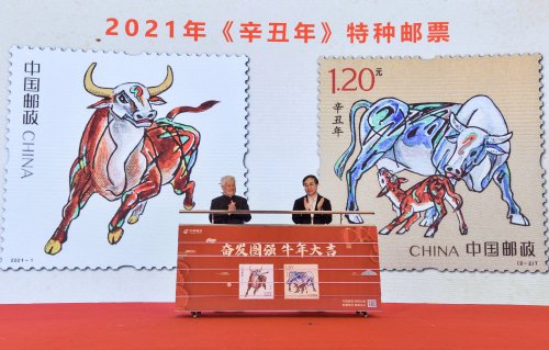 當日, “金牛賀歲” 2021辛丑年生肖郵票展覽在北京中國郵政郵票博物館舉行。《辛丑年》特種郵票設計者、藝術家姚鐘華接受新華社記者采訪,分享關于郵票創作的故事。《辛丑年》特種郵票的設計延續了第四輪生肖郵票的“家國”理念,郵票第一枚“奮發圖強”,描繪了雄壯有力、一往無前的奔牛形象。公牛四蹄揚起,昂首向前,目光炯炯,表達出不畏艱險、砥礪前行,為實現中華民族偉大復興而努力奮斗的寓意。第二枚“牛年大吉”,通過大牛與小牛舐犢情深的溫馨畫面,向全國人民傳遞家庭興旺和諧、團圓美滿的美好祝愿。