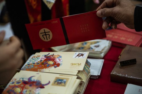 1月5日,在長春郵政站前集郵專賣店,集郵愛好者購買《辛丑年》特種郵票。新華社記者 張楠攝