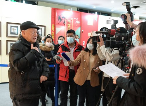 1月5日,《辛丑年》特種郵票設計者、藝術家姚鐘華在展廳接受媒體記者的采訪。新華社記者 李賀 攝