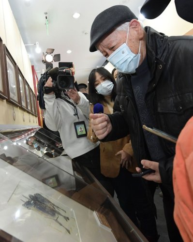 1月5日,《辛丑年》特種郵票設計者、藝術家姚鐘華在展廳看到自己于三十多年前為中國郵政《乙丑年》特種郵票繪制的稿樣原件時難掩激動情緒。新華社記者 李賀 攝