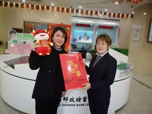 郵儲銀行山東省分行在牛年春節即將到來之際,為客戶送上暖暖的節日祝福。圖為淄博市分行在廳堂舉辦"金牛送福”抽獎活動,為來辦業務的客戶派送“小金牛”和福字對聯禮包,營造良好的節日氛圍。