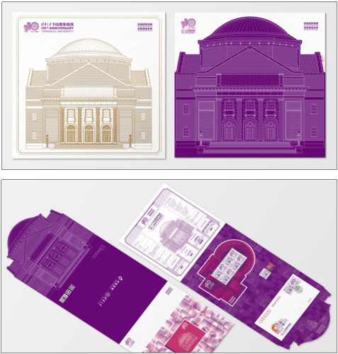 該套郵票特邀清華美術學院陳楠教授團隊設計,主票畫面以“清華紫”結合豐富的變化層次為畫面主基調,采用插畫形式表現了清華大學最具辨識度的校園歷史景觀——二校門,突出了校門的厚重感和歷史感,背景淡雅多姿的花朵為象征團隊精神的清華大學校花——紫荊花,飛舞的花瓣象征了勤奮學習的莘莘學子和默默耕耘的辛勤園丁。附票畫面以清華大學110年校慶專用標志為畫面主體,結合標志的網格制圖原理,并搭配燙金設計效果,形成理性、現代的設計風格,整體畫面積極向上、自由活潑,凸顯出校慶的熱烈氛圍。