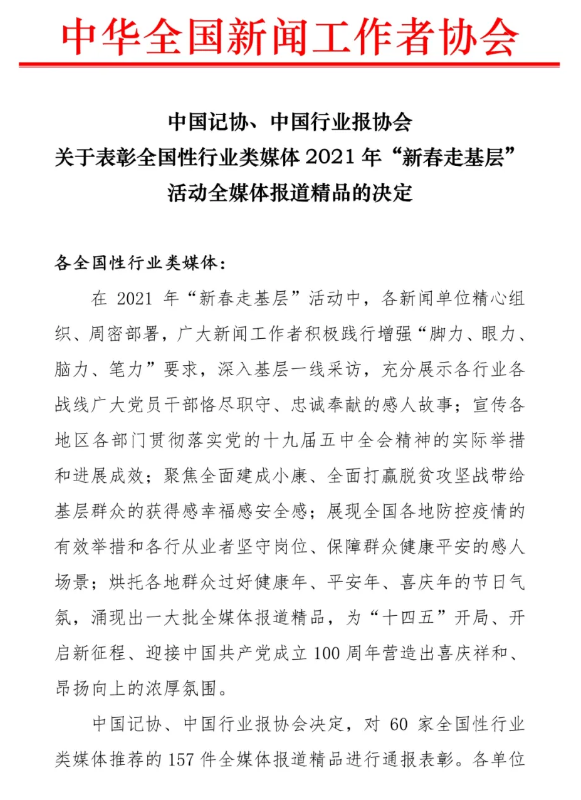 4月23日,中國記協(xié)、中國行業(yè)報(bào)協(xié)會發(fā)布關(guān)于表彰全國性行業(yè)類媒體2021年“新春走基層” 活動全媒體報(bào)道精品的決定,對60家全國性行業(yè)類媒體推薦的157件全媒體報(bào)道精品進(jìn)行通報(bào)表彰。《中國郵政報(bào)》社的3件作品榜上有名,它們是:《這位郵政小哥憑啥上春晚》(程雪梅、陳顥月、楊佳昕、王勤東、雷浩彬),《家的味道》(呂磊、臧弋萱、張明月、汪堯、楊艷),《走郵路 看中國》(集體)。