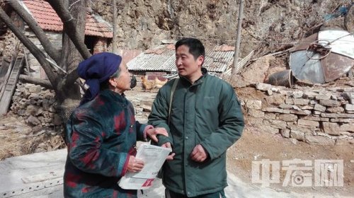 招遠(yuǎn)郵政霞塢支局投遞員李翠祥為黑都坡村盲人送盲人讀物郵件
