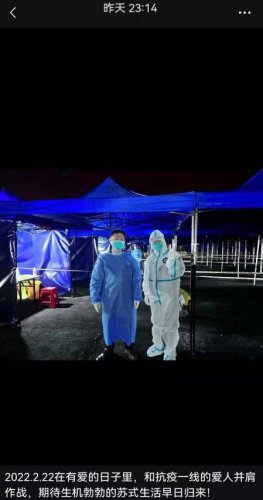 朋友圈里,他這樣記錄道:“2022.2.22在有愛的日子里,和抗疫一線的愛人并肩作戰(zhàn),期待生機(jī)勃勃的蘇式生活早日歸來!”