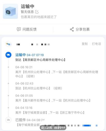 周爸爸查詢了信息,今天上午7點,郵件已經(jīng)到達南京郵區(qū)中心局郵件處理中心,預(yù)計今天就能送達目的地。
