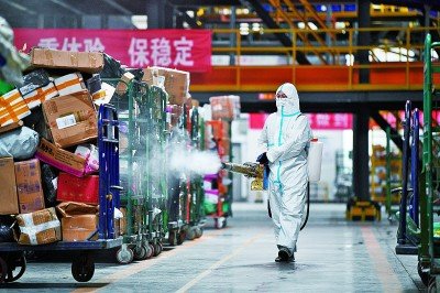 在中國郵政寧夏銀川郵區中心局郵件處理中心,工作人員在分揀車間進行消殺作業。 新華社發