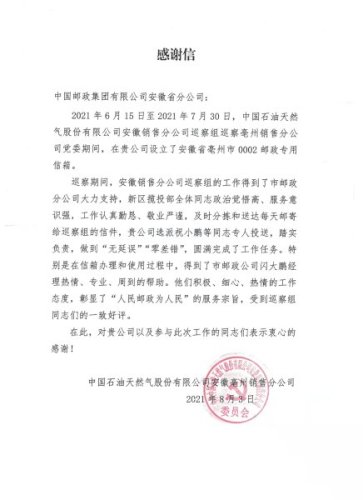今年8月份,亳州市分公司還收到了來(lái)自中國(guó)石油天然氣股份有限公司安徽亳州銷售分公司的感謝信,感謝亳州市分公司在安徽銷售分公司巡察期間提供的高質(zhì)量郵政服務(wù)。