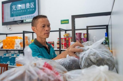 9月15日,在何家巖村村郵站,投遞員張永洪整理待寄的大山土特產。