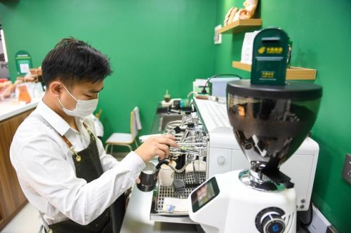 2月15日,咖啡師在深圳咖啡主題郵局制作咖啡。新華社記者 毛思倩 攝