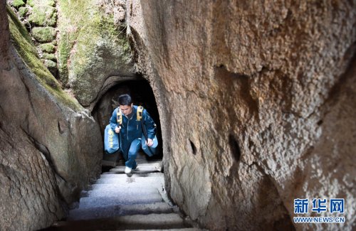 3月16日,休息間隙,謝菲俊放下郵包,一邊擦汗一邊欣賞黃山美景。