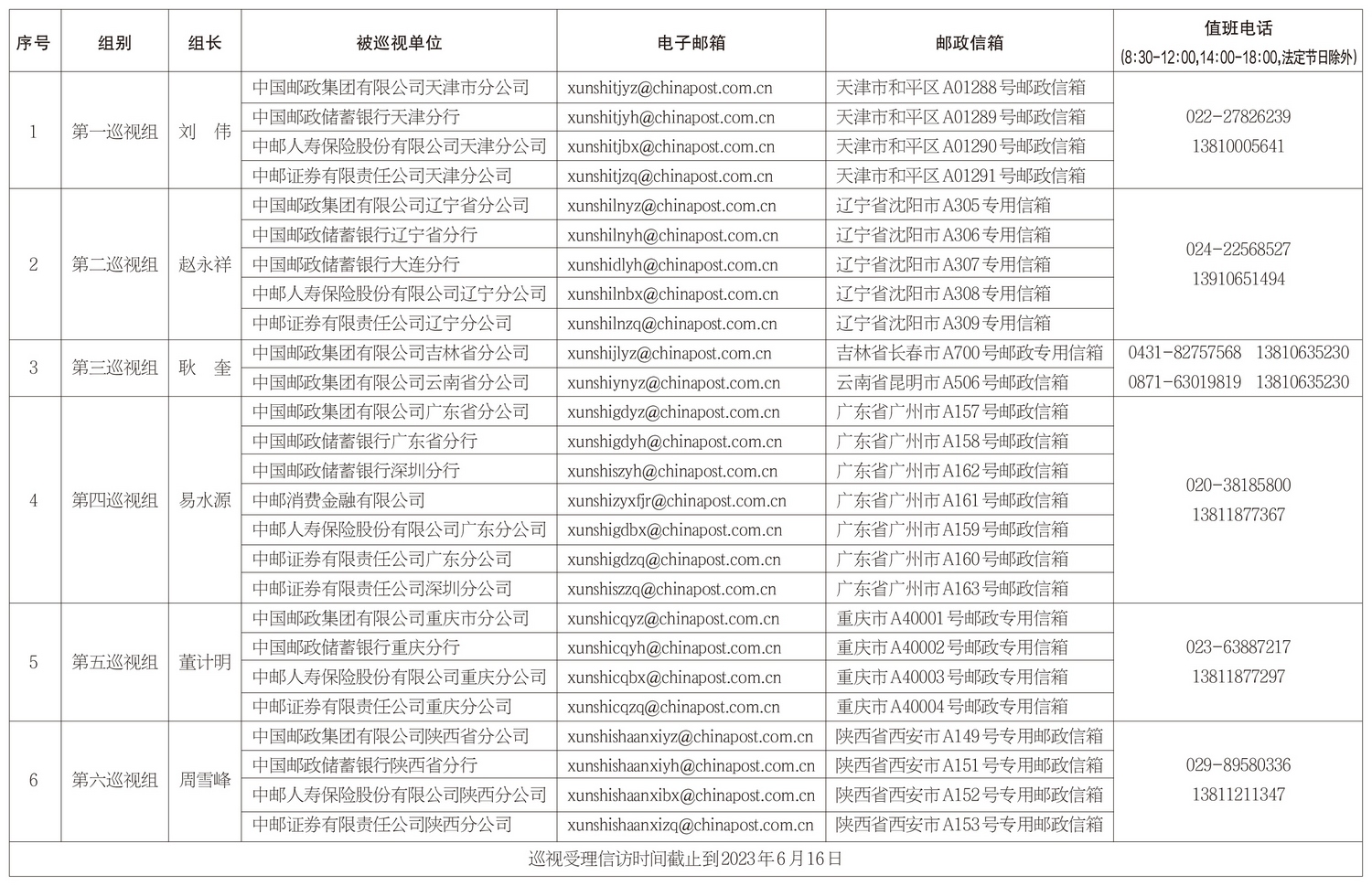中國郵政集團有限公司黨組2023年第一批巡視進駐一覽表