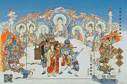 該套郵票是中國郵政自2015年發(fā)行的《中國古典文學(xué)名著——〈西游記〉》系列郵票的第五組,描繪了小說第七十四回至第一百回的五段故事場(chǎng)景。4枚郵票分別表現(xiàn)的是,孫悟空在獅駝嶺大戰(zhàn)青毛獅子、黃牙老象、大鵬雕三怪時(shí)激烈的打斗場(chǎng)景;孫悟空、豬八戒為救助被當(dāng)作藥引的比丘國眾孩童,在南極仙翁幫助下收服白鹿精、擒殺白面狐貍的場(chǎng)景;哪吒隨孫悟空去陷空山無底洞,擒獲欲強(qiáng)迫唐僧成親的金鼻白毛老鼠精的場(chǎng)景;孫悟空領(lǐng)著月宮主人太陰星君來到天竺國,收服假冒公主的廣寒宮搗藥玉兔的場(chǎng)景。小型張表現(xiàn)了師徒四人和白龍馬取回真經(jīng)后,真身返回靈山,終成正果的場(chǎng)景。畫家運(yùn)用傳統(tǒng)工筆重彩的手法,同時(shí)注重以形寫神,人物刻畫逼真?zhèn)魃瘢诜酱玳g生動(dòng)地演繹出大家熟知的故事情節(jié)。