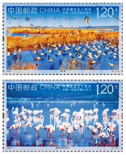 《中西建交五十周年》紀念郵票一套兩枚。郵票畫面以攝影作品為基礎,表現(xiàn)了中國的衡水湖與西班牙的富恩特皮埃德拉湖,展現(xiàn)出兩國湖泊的旖旎風光和自然生態(tài)特征,畫面構圖簡約明快、表現(xiàn)意境清朗優(yōu)美。該套郵票由馬立航設計,北京郵票廠有限公司采用影寫版工藝印制。西班牙郵政將使用同樣的設計元素發(fā)行以“中西建交五十周年”為主題的郵票。