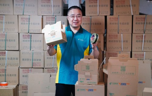 刁海濤帶著記者來到中國郵政集團有限公司北京市分公司一處擺滿貨架和快遞箱的生產現場。“1、2、3、4、5……”不到一分鐘的工夫,一個無需膠帶、僅靠拼插即可成型的快遞紙箱就在刁海濤手中組裝完畢。“咚!”他向剛剛拼插好的快遞紙箱重重擊打了一拳,紙箱表面只有輕微的凹陷,并沒有發生任何損壞。刁海濤解釋說,這款專利包裝箱借鑒了中國傳統的榫卯技術,單純依靠折疊、插接就能快速組裝完成,完全不需要使用膠帶進行封裝。別看比普通紙箱的重量輕,但這款專利產品的邊壓強度、耐戳穿力、抗跌落能力等指標,都遠比普通紙箱要強得多。