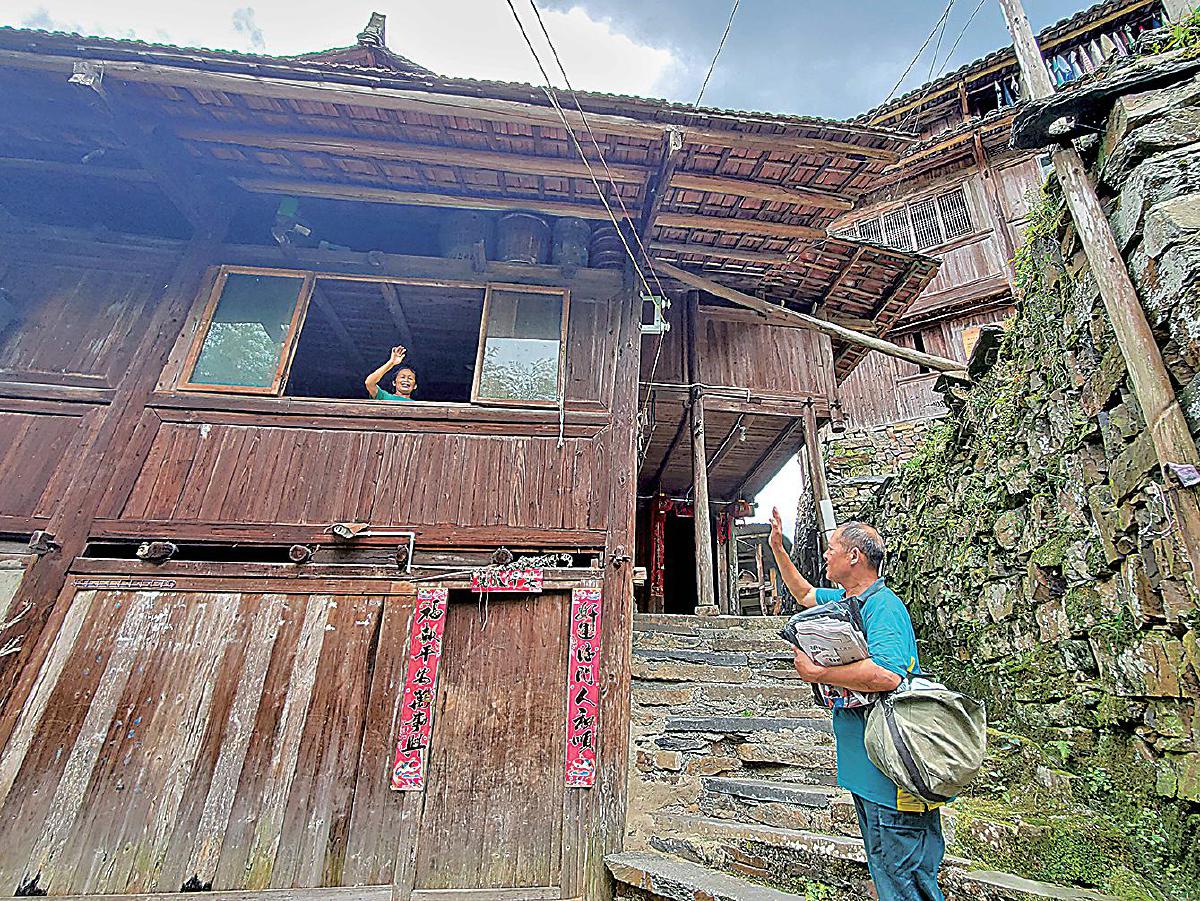多年投遞讓張林昌和鄉(xiāng)親們成了親人,行之所至,總有老鄉(xiāng)與他熱情打招呼。 □韓靜樺 攝